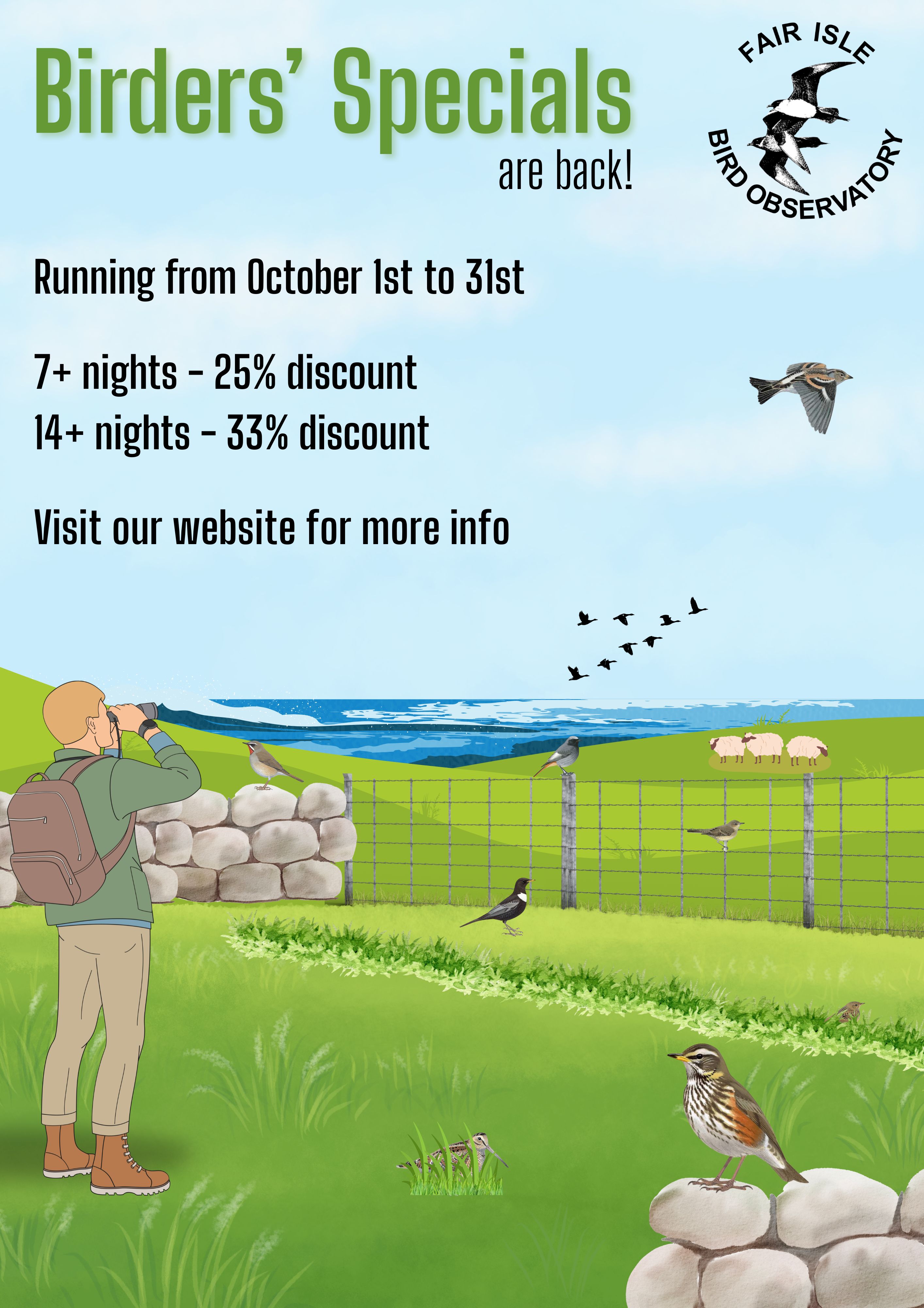 Fair Isle Bird Obs is delighted to announce that you can now make a late autumn visit to our newly opened observatory at a substantial discount on our standard rates. Get yourself a special deal with prices from £99 per person per night‡ (with full-board, en suite accommodation) during 1st-31st October 2026.