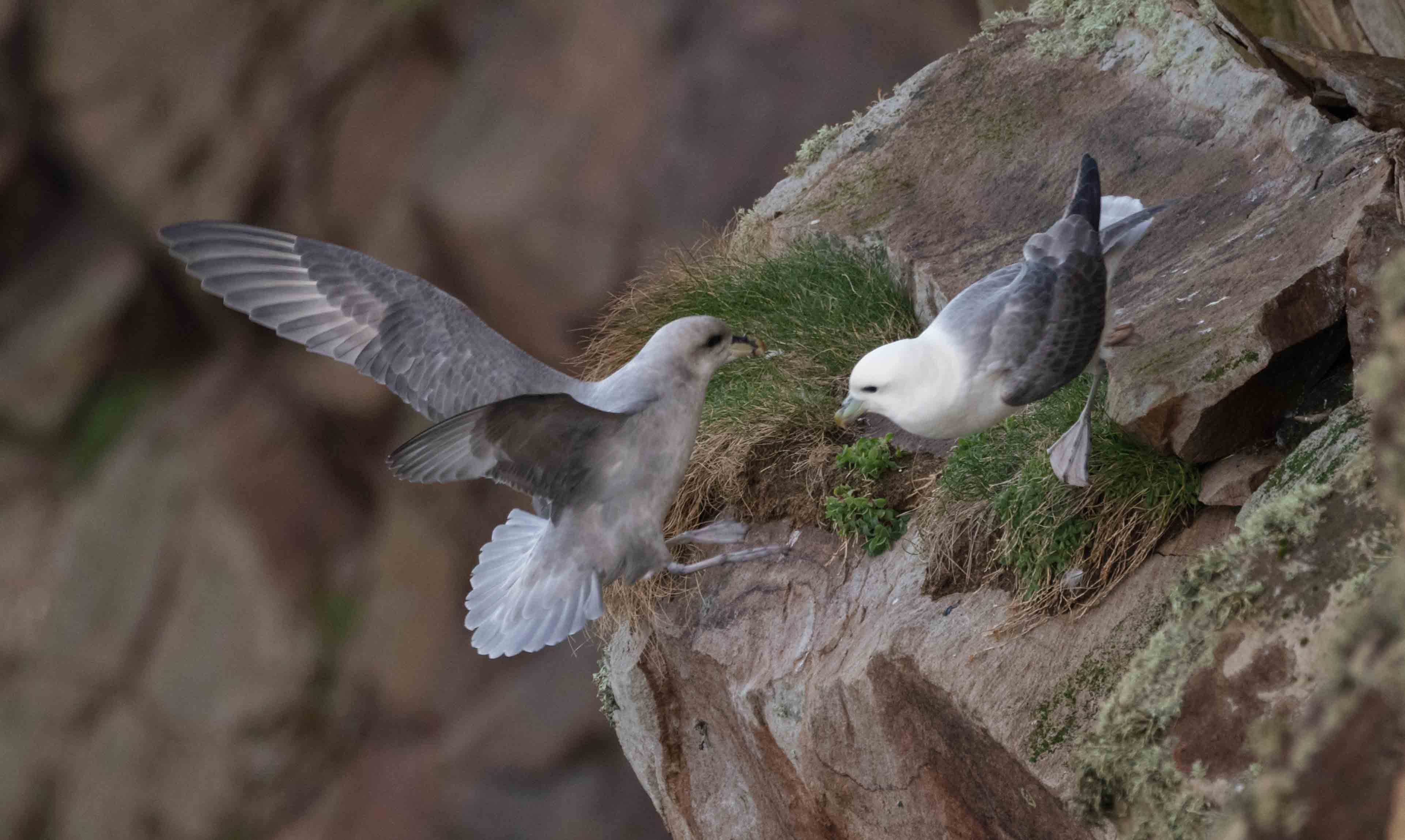 Two Blue Fulmar have been seen returning to ledges used last year, this one kicking off an intruding pale bird at Lericum (Alex Penn)