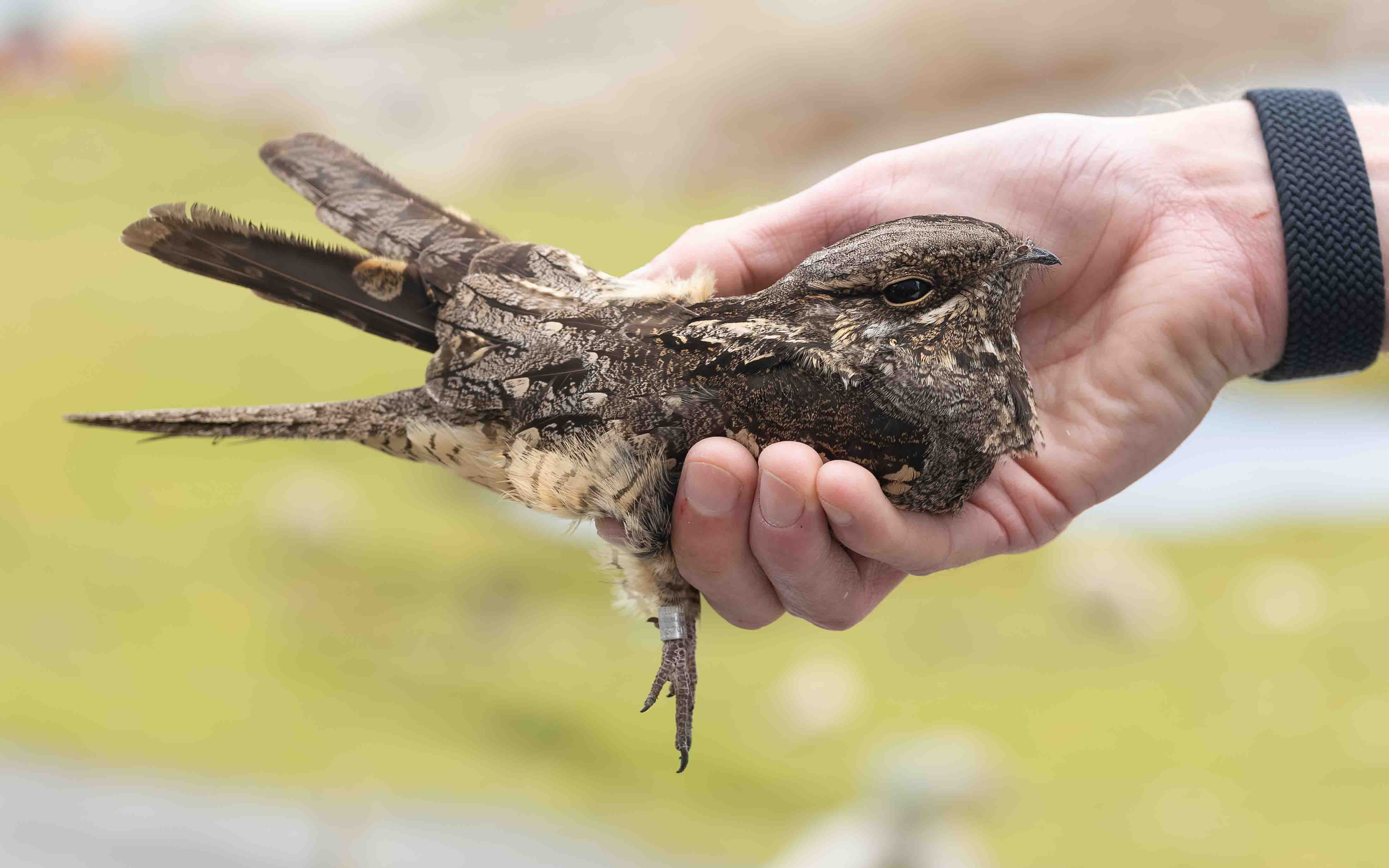 After playing cat-and-mouse for several days around the Gully trap, the female Nightjar was finally caught and ringed (Alex Penn)